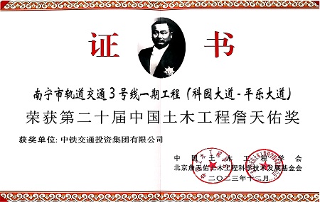 • 斬獲雙料大獎!中鐵交通南寧軌道交通3號線項目再獲詹天佑獎